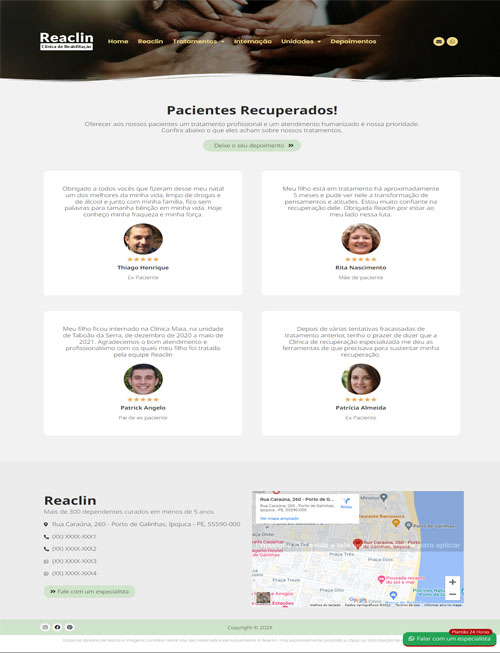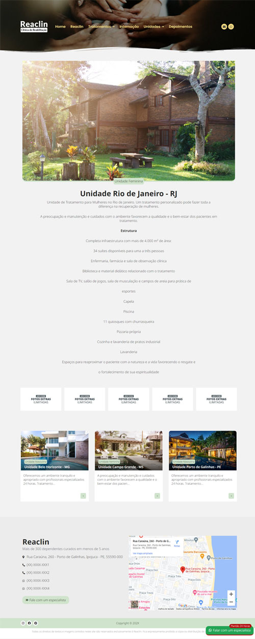 Com um layout limpo e responsivo, a solução permite exibir de forma detalhada todos os modelos de internação (voluntária, involuntária e compulsória) e os tipos de tratamentos oferecidos, como dependência química e alcoolismo. O diferencial competitivo reside na prova social: uma área dedicada a depoimentos de pacientes recuperados e uma galeria de fotos de alta performance para apresentar a infraestrutura das unidades, gerando segurança absoluta antes mesmo do primeiro contato.