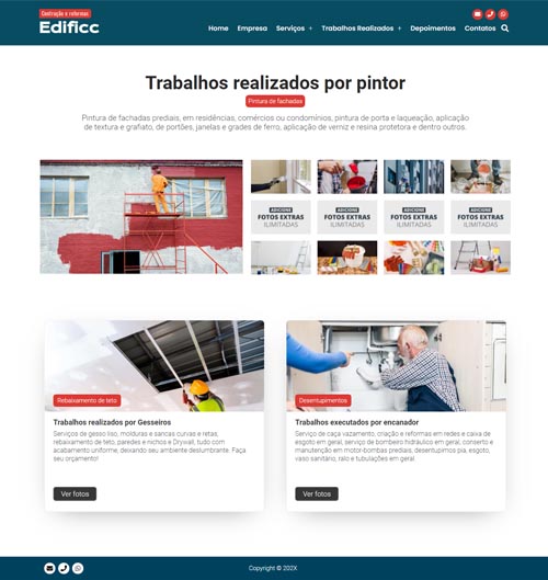 O projeto Construção Civil 06 é a ferramenta definitiva para transformar sua empresa de construção em uma autoridade digital. Com um design focado em conversão de leads, ele permite exibir seus serviços de forma profissional e completa, incluindo galerias de fotos ilimitadas para cada tipo de especialidade.