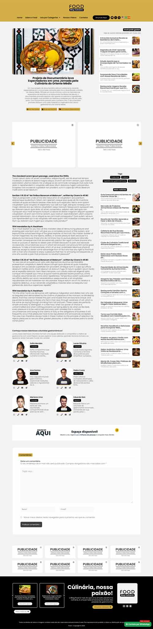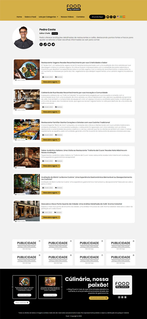 Cabeçalho do blog de culinária Noticias 04 com destaque para notícia principal e menu de categorias.
