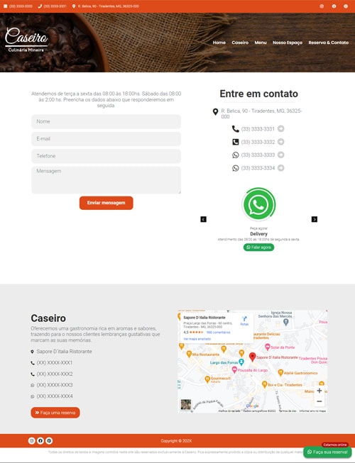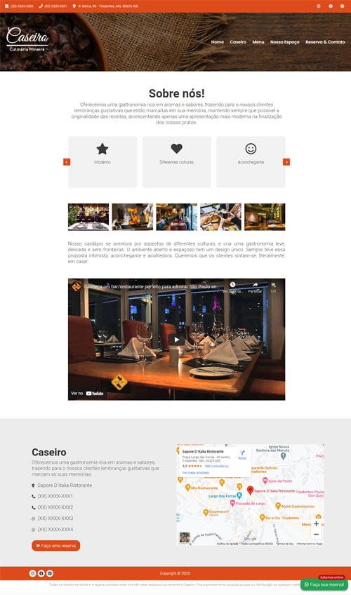 Além da estética impecável, o projeto é otimizado para performance e SEO, garantindo que seu restaurante seja encontrado facilmente no Google. Com recursos como chat online (JivoChat), gestão de redes sociais integrada e rodapés com chamadas para ação (CTA) poderosas, o Restaurante 01 não é apenas um site, mas uma máquina de vendas para o setor de alimentação.