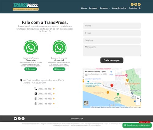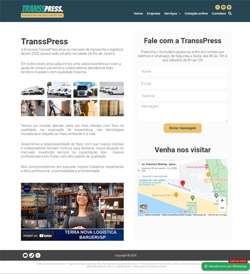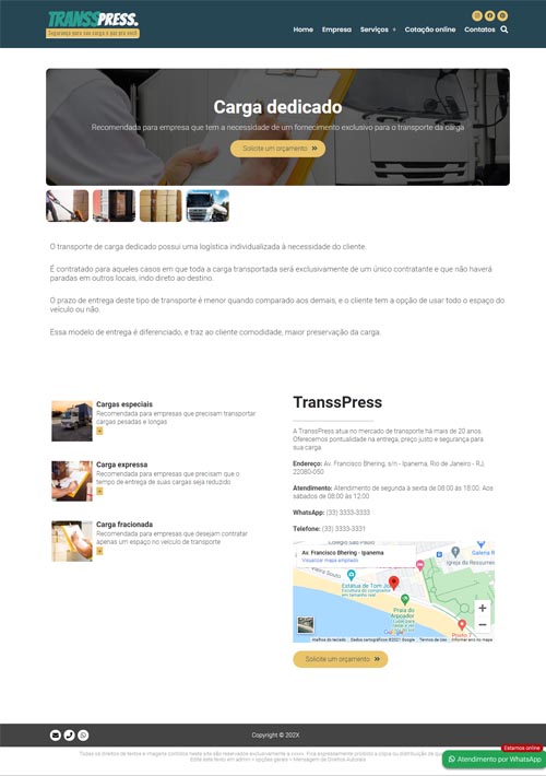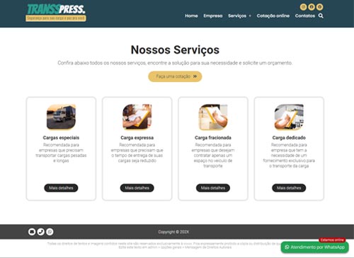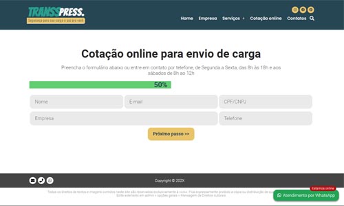 O grande diferencial estratégico é a Cotação Online integrada, permitindo que seus clientes solicitem orçamentos diretamente pelo site, com todos os dados chegando organizados em seu e-mail. Além disso, o projeto conta com uma poderosa integração com WhatsApp, permitindo o cadastro de múltiplos departamentos e atendentes para um suporte ágil e humanizado.